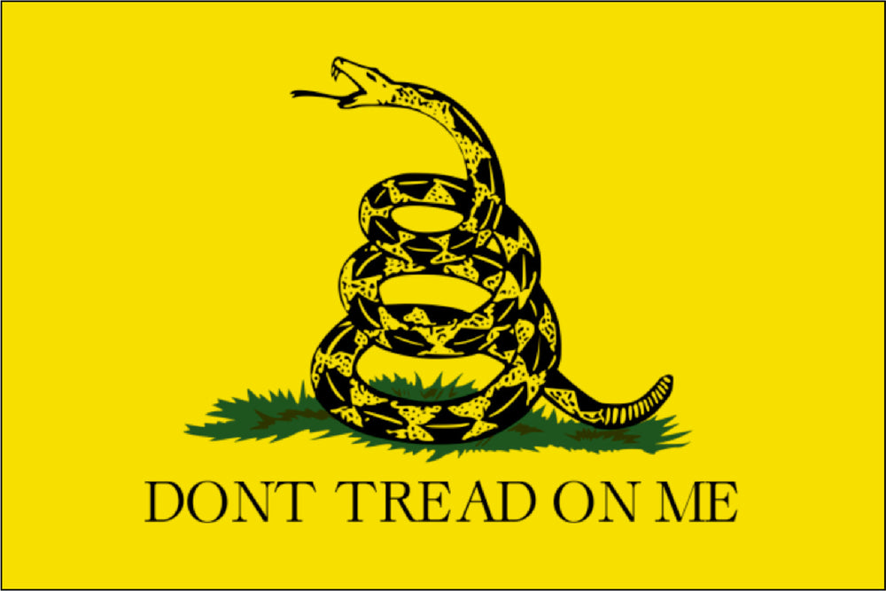 Based on a design by Colonel Christopher Gadsden and given to Commodore Esek Hopkins, commander of the new Continental Fleet, as his personal distinctive banner when the U.S. Navy first started putting ships out to sea to intercept British ships carrying war supplies to the British troops in the colonies. Also referred to as the "Don't Tread On Me" flag.