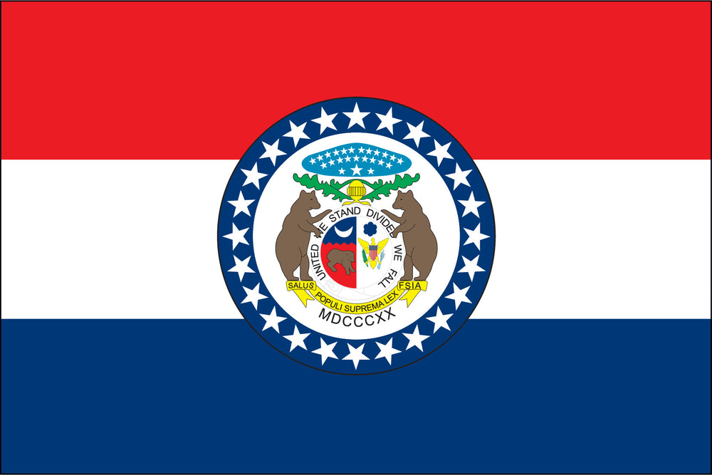 Missouri Flag. Heavyweight durable nylon flag finished with a strong canvas heading and two brass grommets. Centered on a field of red, white and blue stripes is the Missouri state seal. It is encircled by a blue band with twenty-four stars representing the number of states in 1821. The stars in the inner circle have the same meaning. Two huge grizzly bears support the circular shield in the center which holds the state motto (“United We Stand, Divided We Fall”) and is divided into three sections; The right section representing the United States, the top left section containing a moon...