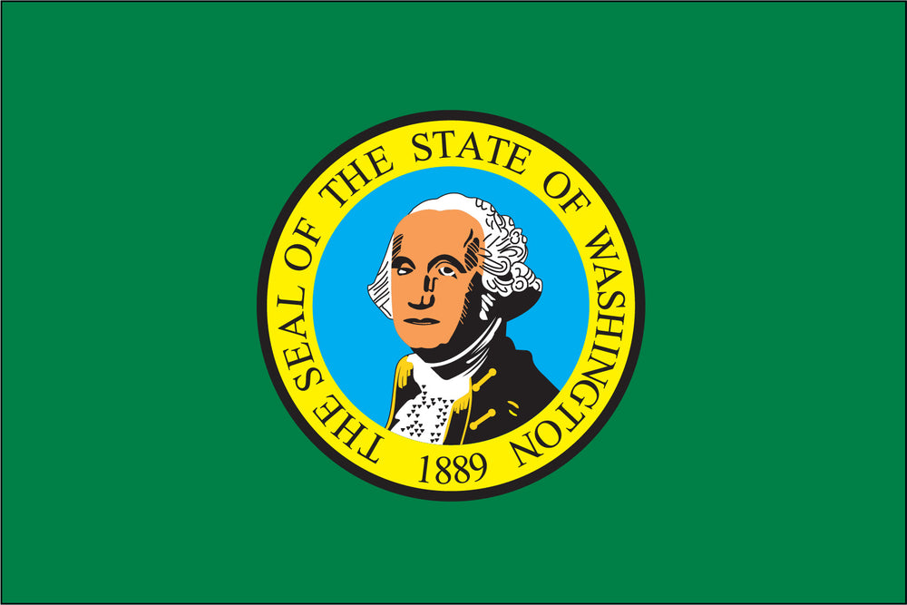 Washington Flag. Heavyweight durable nylon flag finished with a strong canvas heading and two brass grommets. The state flag and the state seal are similar. Passed in 1923, Washington state law describes the flag as having dark green bunting with a state seal in the center. It is the only state flag that is green. It is also the only state flag with a picture of a president.