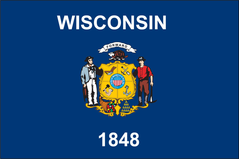 Wisconsin FlagHeavyweight durable nylon flag finished with a strong canvas heading and two brass grommets. Starting at the top of a shield on a dark blue field is the state motto "Forward". Below it is a badger, the state animal. A sailor and miner show that the people work on water and land. The shield in the center shows Wisconsin's support for the United States. In four sections surrounding the shield are representations of the states main industries: Agriculture, mining, manufacturing and navigation. The cornucopia and pile of lead represent farm products and minerals. The flag law was amended...