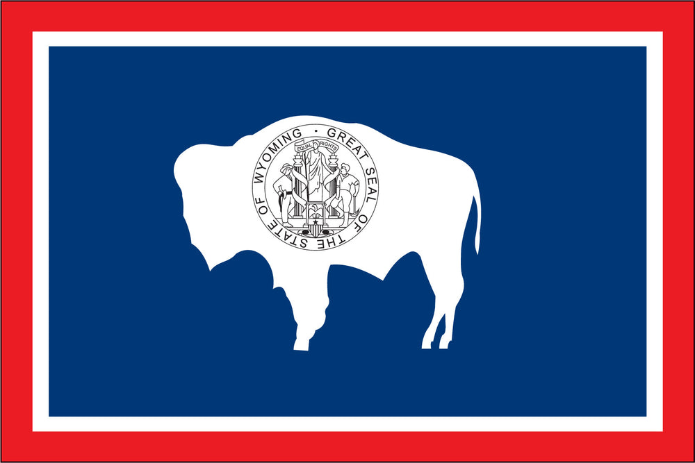 Wyoming Flag. Heavyweight durable nylon flag finished with a strong canvas heading and two brass grommets. The state flag of Wyoming has an image of a bison on a blue field and bordered in red. The state seal is “branded” on the bison. The woman in the seal represents the state motto “Equal Rights” and the two men represent cattle ranchers and mining. The words “Livestock, Mines, Grains and Oil” represent Wyoming’s wealth. The Eagle and shield show support for the United States. The dates 1869 and 1890 tell when Wyoming organized as a territory of the United States...